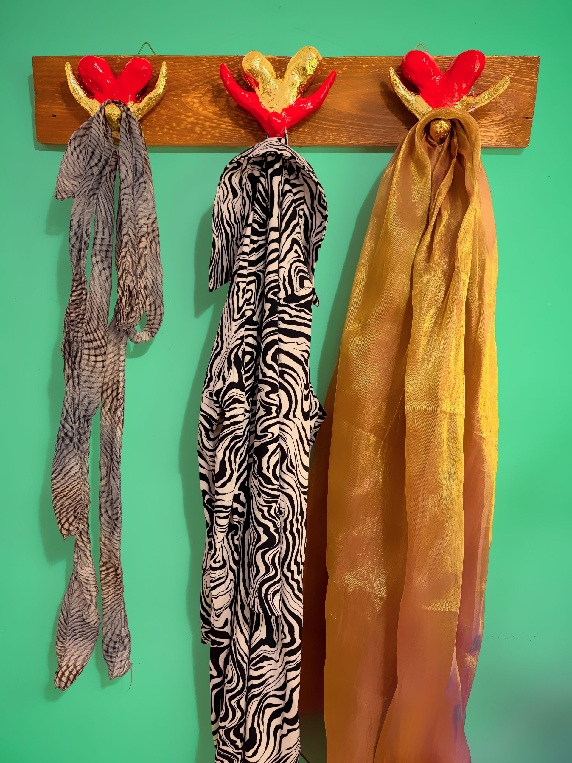 En este caso, la obra tomó la forma de un colgador de pared compuesto por tres clítoris entrelazados, trabajados en tonos rojos y dorados. Una pieza que no busca ser discreta ni decorativa en el sentido convencional, sino abrir conversación, presencia y cuerpo en el espacio.